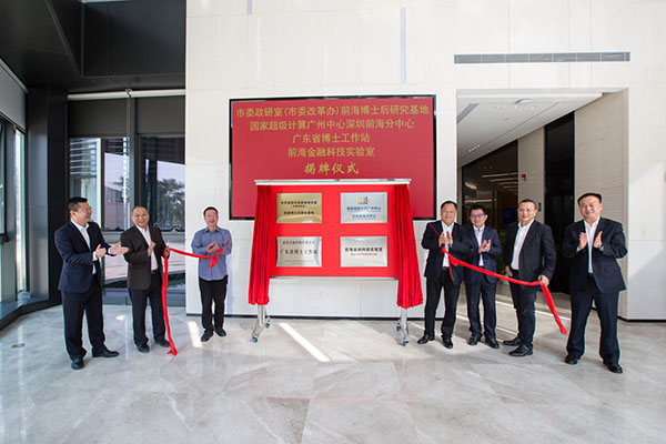 簽約儀式結(jié)束后,杜鵬、孫波等領(lǐng)導(dǎo)共同為市委政研室前海博士后研究基地、國(guó)家超級(jí)計(jì)算廣州中心深圳前海分中心、廣東省博士工作站和前海金融科技實(shí)驗(yàn)室等創(chuàng)新載體和研究平臺(tái)揭牌。