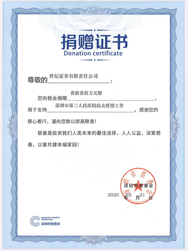 據(jù)了解,疫情發(fā)生后,世紀(jì)證券認(rèn)真貫徹落實(shí)黨中央、國務(wù)院、證監(jiān)會的決策部署,始終將員工和客戶安全放在首要位置,將疫情防控作為當(dāng)前工作的重中之重。同時,世紀(jì)證券踐行初心使命,主動履行企業(yè)社會責(zé)任,在了解到深圳市第三人民醫(yī)院作為深圳市新冠病毒感染肺炎確診患者的集中收治醫(yī)院的情況后,向深圳市慈善會捐贈100萬元,定向用于該院的疫情抗擊工作。除了此次定向捐贈,此前世紀(jì)證券全體員工還借助互聯(lián)網(wǎng)公益平臺參與肺炎疫情防控專項(xiàng)募捐,在短短3天時間內(nèi)便募集金額 9.7萬元,所籌款項(xiàng)均實(shí)時直達(dá)湖北省慈善總會“緊急救援新冠肺炎”專項(xiàng)募捐項(xiàng)目。