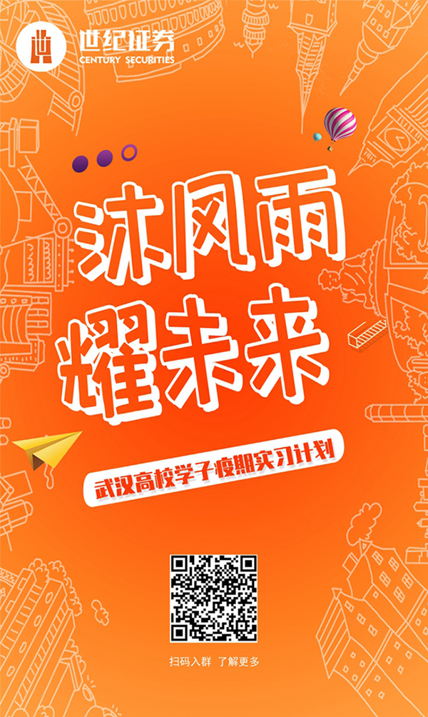 此外,世紀(jì)證券積極響應(yīng)武漢高校學(xué)子的實(shí)習(xí)和就業(yè)需求,啟動了“沐風(fēng)雨 耀未來”武漢高校學(xué)子疫期實(shí)習(xí)計劃,面向目前就讀于武漢地區(qū)高校、因疫情原因無法返校的全日制本科及以上學(xué)歷在校學(xué)生,為優(yōu)秀學(xué)子提供職業(yè)發(fā)展平臺。應(yīng)聘學(xué)子可按照“就近原則”在世紀(jì)證券總部和60家分公司、營業(yè)部中選擇疫情較輕地區(qū)的崗位,在世紀(jì)證券的統(tǒng)籌安排下參加在線“云面試”獲取實(shí)習(xí)機(jī)會。