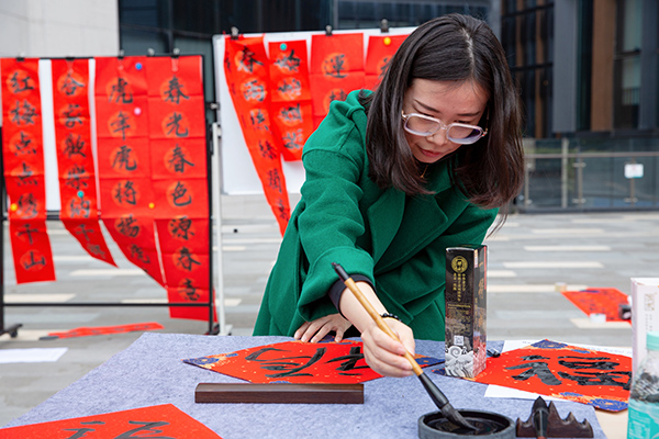 活動(dòng)現(xiàn)場(chǎng),專(zhuān)業(yè)書(shū)法老師凝神聚氣、揮毫潑墨,一副副對(duì)聯(lián)蒼勁有力、氣韻生動(dòng)?,F(xiàn)場(chǎng)群眾興致勃勃地挑選各種贊頌時(shí)代、歡慶新春的春聯(lián)?!按荷髅纳胶优\繡、華夏騰飛祖國(guó)萬(wàn)年輕”“虎添雙翼前程遠(yuǎn)、國(guó)展宏圖事業(yè)新”“平安如意吉星照、金虎呈祥福滿(mǎn)堂”……大家互相幫忙,有的忙著牽紙,有的忙著晾曬,臉上無(wú)不洋溢著幸福和喜悅。