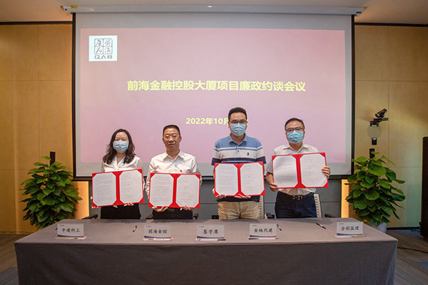 會上,參建單位代表圍繞如何加強建設(shè)項目黨風(fēng)廉政建設(shè)工作進行了深入交流。前海金控公司與中建科工、金地集團、合創(chuàng)公司聯(lián)合簽署了《廉潔共建合作備忘錄》,作為各方共同遵守的廉潔合作行為準則。