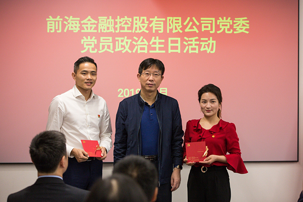 啟用儀式結(jié)束后,前海金控在黨群服務(wù)中心舉行了第一場黨的活動,為第二季度入黨的黨員集體過“政治生日”,何子軍同志為黨員代表頒發(fā)了“政治生日卡”。